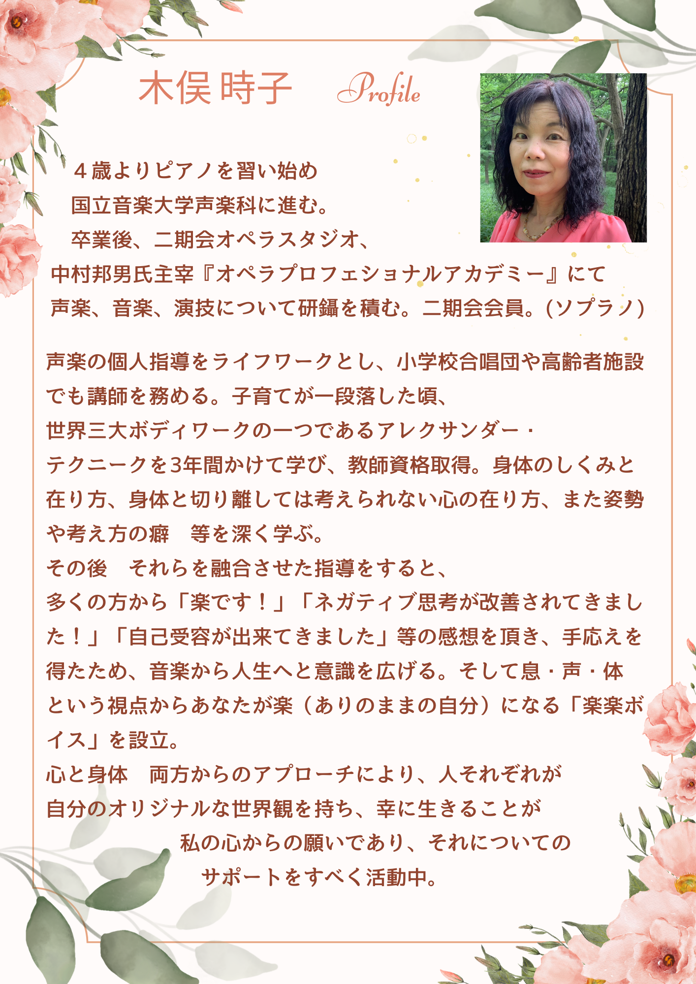 こんにちは。木俣時子です。 私は声楽家であり、アレクサンダー・テクニック教師です。 かれこれ40年間 声についての探求してきました。 100人以上の方の声を聴かせて頂く中で 大切にしているのは 無理をして大きな声を出すのでなく 他人の真似をして声を作るのでなく ★世界に1つだけのあなた自身の声を出す ということです。 自分の声がどんな声なのか? 高いのか?低いのか? 強いのか?デリケートなのか? これは、なかなか難しい問題です。 私も長い間、自分の声が分からず 理想の声を求めて随分苦労しました。 そして分かったことは 自分を一番生かすことが出来る 本当の自分の声を出すには 声のことだけを観てもダメだ ということです。 では何を観れば良いのか?